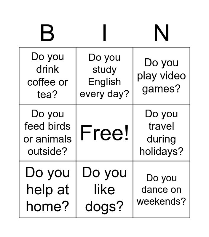 Conversation Bingo | Conversation Bingo | Bingo. Present simple questions | Do you....? | Bingo. Present simple questions