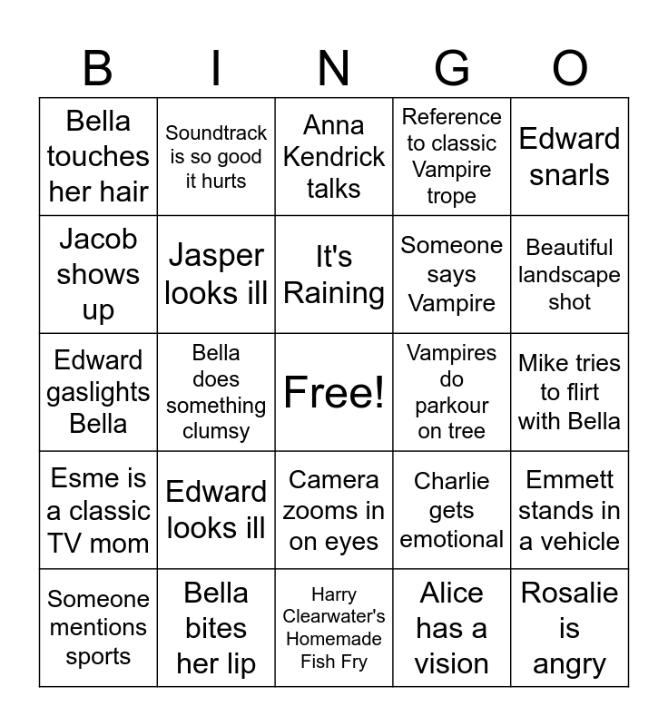 This bingo card has a free space and 24 words: Edward looks ill, Bella bites her lip, It's Raining, Someone mentions sports, Edward snarls, Bella touches her hair, Jacob shows up, Soundtrack is so good it hurts, Vampires do parkour on tree, Camera zooms in on eyes, Someone says Vampire, Edward gaslights Bella, Charlie gets emotional, Emmett stands in a vehicle, Jasper looks ill, Alice has a vision, Mike tries to flirt with Bella, Anna Kendrick talks, Beautiful landscape shot, Bella does something clumsy, Rosalie is angry, Esme is a classic TV mom, Reference to classic Vampire trope and Harry Clearwater's Homemade Fish Fry.