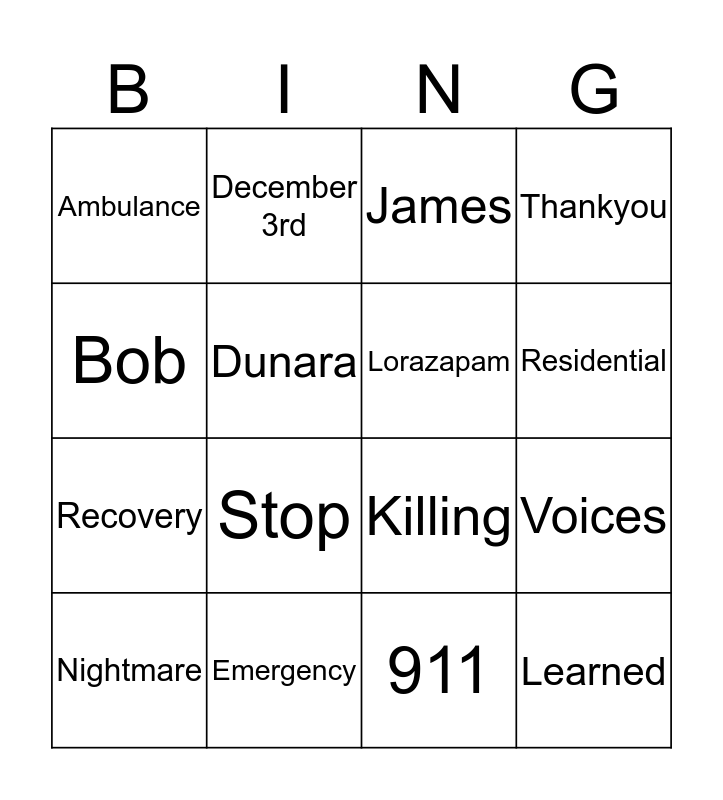 This bingo card has a free space and 15 words: Nightmare, Learned, James, Ambulance, Residential, Bob, Stop, 911, Dunara, Recovery, Voices, Thankyou, Lorazapam, December 3rd and Emergency.