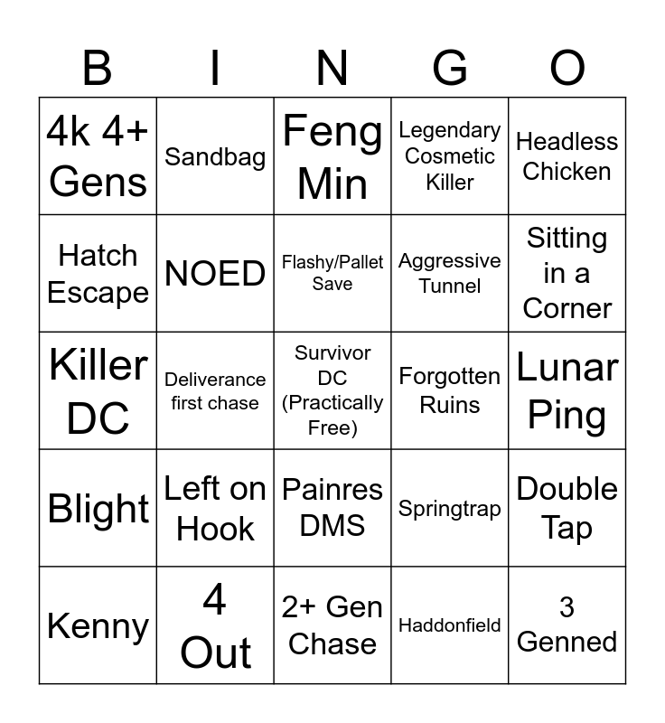 This bingo card has a free space and 24 words: Left on Hook, 4 Out, Flashy/Pallet Save, Kenny, Headless Chicken, 4k 4+ Gens, Hatch Escape, Sandbag, Forgotten Ruins, Painres DMS, Aggressive Tunnel, Killer DC, Springtrap, Double Tap, NOED, Haddonfield, Lunar Ping, Feng Min, Sitting in a Corner, Deliverance first chase, 3 Genned, Blight, Legendary Cosmetic Killer and 2+ Gen Chase.