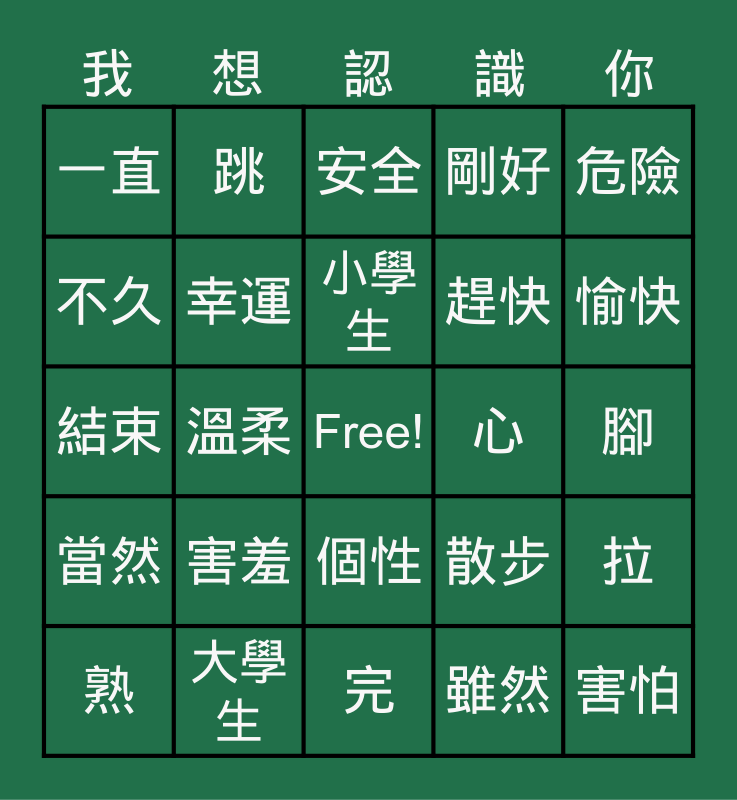 This bingo card has a free space and 24 words: 害羞, 大學生, 小學生, 熟, 危險, 一直, 不久, 跳, 心, 個性, 趕快, 結束, 散步, 拉, 幸運, 雖然, 腳, 安全, 愉快, 溫柔, 害怕, 當然, 剛好 and 完.