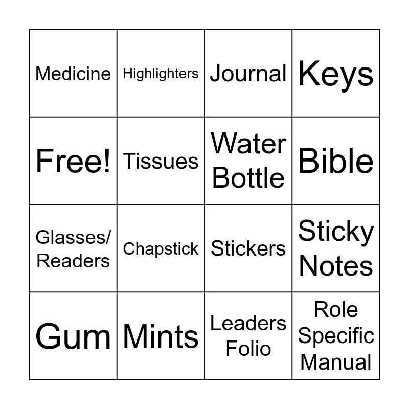 This bingo card has 16 words: Mints, Sticky Notes, Journal, Medicine, Glasses/ Readers, Highlighters, Stickers, Leaders Folio, Free!, Tissues, Gum, Keys, Chapstick, Bible, Water Bottle and Role Specific Manual.