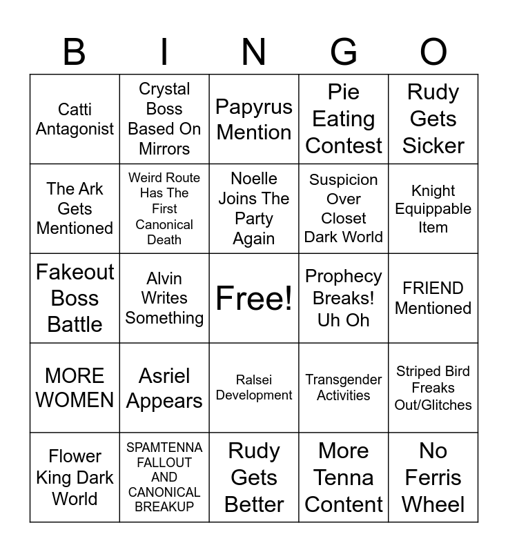 This bingo card has a free space and 34 words: Mike(s) Appearance, More Tenna Content, Ferris Wheel Breaks Down, Jevil Appearance/Mention, MORE WOMEN, Weird Route Has The First Canonical Death, Rudy Gets Sicker, Flower King Dark World, Crystal Boss Based On Mirrors, Ralsei Leaves The Party, Noelle Joins The Party Again, Papyrus Mention, Noelle's House Is Revisited, Carol Gets Confronted, Prophecy Breaks! Uh Oh, Knight Equippable Item, SPAMTENNA FALLOUT AND CANONICAL BREAKUP, Fakeout Boss Battle, Asriel Appears, Transgender Activities, Ralsei Development, Roaring Doesn't Happen Yet, Catti Antagonist, FRIEND Mentioned, Rudy Gets Better, No Ferris Wheel, Pie Eating Contest, Toriel Gets A New TV, Suspicion Over Closet Dark World, The Ark Gets Mentioned, Another Video Game Inside The Game, Alvin Writes Something, Striped Bird Freaks Out/Glitches and Diner Closes.