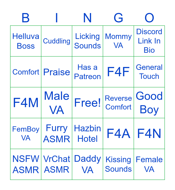This bingo card has a free space and 24 words: Furry ASMR, VrChat ASMR, Has a Patreon, NSFW ASMR, Discord Link In Bio, Helluva Boss, Comfort, Cuddling, Reverse Comfort, Hazbin Hotel, F4F, F4M, F4A, F4N, Praise, Kissing Sounds, Good Boy, Licking Sounds, General Touch, Male VA, Female VA, FemBoy VA, Mommy VA and Daddy VA.