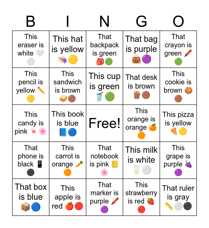 This bingo card has a free space and 30 words: This apple is red ππ΄, That banana is yellow ππ‘, This book is blue ππ΅, That pen is black ποΈβ«, This eraser is white π€βͺ, That backpack is green ππ’, This sandwich is brown π₯ͺπ€, That notebook is pink ππΈ, This orange is orange ππ , That marker is purple ποΈπ£, This pizza is yellow ππ‘, That ruler is gray πβͺβ«, This strawberry is red ππ΄, That paper is white πβͺ, This cookie is brown πͺπ€, That chair is blue πͺπ΅, This milk is white π₯βͺ, That phone is black π±β«, This carrot is orange π₯π , That crayon is green ποΈπ’, This candy is pink π¬πΈ, That ball is red β½π΄, This hat is yellow ππ‘, That desk is brown πͺ΅π€, This pencil is yellow βοΈπ‘, That bag is purple ππ£, This grape is purple ππ£, That box is blue π¦π΅, This cup is green π₯€π’ and That shoe is black πβ«.