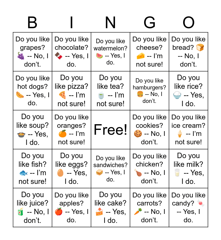 This bingo card has a free space and 30 words: Do you like apples? π -- Yes, I do., Do you like bananas? π -- No, I donβt., Do you like oranges? π -- Iβm not sure!, Do you like strawberries? π -- Yes, I do., Do you like grapes? π -- No, I donβt., Do you like watermelon? π -- Yes, I do., Do you like pizza? π -- Iβm not sure!, Do you like sandwiches? π₯ͺ -- Yes, I do., Do you like cookies? πͺ -- No, I donβt., Do you like cake? π° -- Yes, I do., Do you like ice cream? π¦ -- Iβm not sure!, Do you like candy? π¬ -- Yes, I do., Do you like carrots? π₯ -- No, I donβt., Do you like broccoli? π₯¦ -- Iβm not sure!, Do you like rice? π -- Yes, I do., Do you like noodles? π -- Yes, I do., Do you like chicken? π -- No, I donβt., Do you like fish? π -- Iβm not sure!, Do you like eggs? π₯ -- Yes, I do., Do you like bread? π -- No, I donβt., Do you like soup? π² -- Yes, I do., Do you like salad? π₯ -- Iβm not sure!, Do you like chocolate? π« -- Yes, I do., Do you like hamburgers? π -- No, I donβt., Do you like hot dogs? π -- Yes, I do., Do you like cheese? π§ -- Iβm not sure!, Do you like milk? π₯ -- Yes, I do., Do you like juice? π§ -- No, I donβt., Do you like tea? π΅ -- Iβm not sure! and Do you like coffee? β -- Yes, I do..