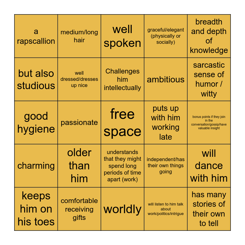 This bingo card has a free space and 24 words: older than him, comfortable receiving gifts, Challenges him intellectually, keeps him on his toes, breadth and depth of knowledge, a rapscallion, but also studious, medium/long hair, puts up with him working late, understands that they might spend long periods of time apart (work), ambitious, good hygiene, independent/has their own things going, will dance with him, well dressed/dresses up nice, will listen to him talk about work/politics/intrigue, bonus points if they join in the conversation/gossip/have valuable insight, well spoken, sarcastic sense of humor / witty, passionate, has many stories of their own to tell, charming, graceful/elegant (physically or socially) and worldly.
