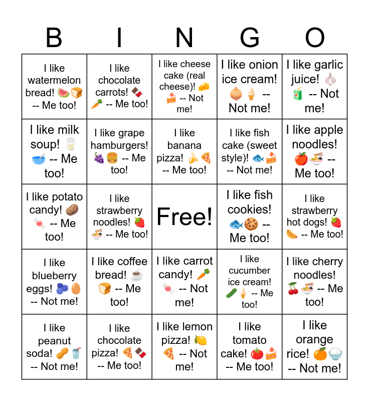 This bingo card has a free space and 30 words: I like chocolate pizza! šš« -- Me too!, I like banana soup! šš„£ -- Not me!, I like strawberry noodles! šš -- Me too!, I like broccoli ice cream! š„¦š¦ -- Not me!, I like watermelon bread! šš -- Me too!, I like cheese cake (real cheese)! š§š° -- Not me!, I like grape hamburgers! šš -- Me too!, I like carrot candy! š„š¬ -- Not me!, I like fish cookies! ššŖ -- Me too!, I like lemon pizza! šš -- Not me!, I like strawberry hot dogs! šš -- Me too!, I like orange rice! šš -- Not me!, I like tomato cake! š š° -- Me too!, I like pineapple soup! šš„£ -- Not me!, I like apple noodles! šš -- Me too!, I like chocolate salad! š«š„ -- Not me!, I like cucumber ice cream! š„š¦ -- Me too!, I like blueberry eggs! š«š„ -- Not me!, I like coffee bread! āš -- Me too!, I like garlic juice! š§š§ -- Not me!, I like potato candy! š„š¬ -- Me too!, I like kiwi pizza! š„š -- Not me!, I like chocolate carrots! š«š„ -- Me too!, I like fish cake (sweet style)! šš° -- Not me!, I like milk soup! š„š„£ -- Me too!, I like onion ice cream! š§ š¦ -- Not me!, I like cherry noodles! šš -- Me too!, I like peanut soda! š„š„¤ -- Not me!, I like banana pizza! šš -- Me too! and I like mushroom candy! šš¬ -- Not me!.