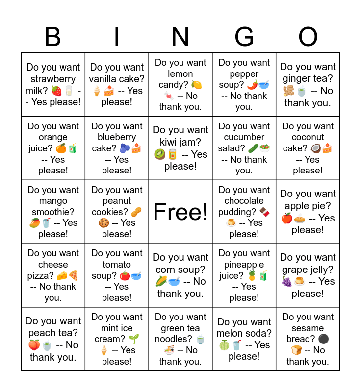 This bingo card has a free space and 30 words: Do you want mint ice cream? š±š¦ -- Yes please!, Do you want honey bread? šÆš -- No thank you., Do you want peanut cookies? š„šŖ -- Yes please!, Do you want butter rice? š§š -- No thank you., Do you want strawberry milk? šš„ -- Yes please!, Do you want lemon candy? šš¬ -- No thank you., Do you want blueberry cake? š«š° -- Yes please!, Do you want corn soup? š½š„£ -- No thank you., Do you want chocolate pudding? š«š® -- Yes please!, Do you want green tea noodles? šµš -- No thank you., Do you want apple pie? šš„§ -- Yes please!, Do you want sesame bread? ā«š -- No thank you., Do you want melon soda? šš„¤ -- Yes please!, Do you want cherry jelly? šš® -- No thank you., Do you want coconut cake? š„„š° -- Yes please!, Do you want red bean ice cream? š«š¦ -- No thank you., Do you want pineapple juice? šš§ -- Yes please!, Do you want cheese pizza? š§š -- No thank you., Do you want tomato soup? š š„£ -- Yes please!, Do you want ginger tea? š«šµ -- No thank you., Do you want mango smoothie? š„š„¤ -- Yes please!, Do you want cinnamon bread? šæš -- No thank you., Do you want vanilla cake? š¦š° -- Yes please!, Do you want cucumber salad? š„š„ -- No thank you., Do you want orange juice? šš§ -- Yes please!, Do you want pepper soup? š¶ļøš„£ -- No thank you., Do you want grape jelly? šš® -- Yes please!, Do you want peach tea? ššµ -- No thank you., Do you want kiwi jam? š„š„« -- Yes please! and Do you want garlic bread? š§š -- No thank you..