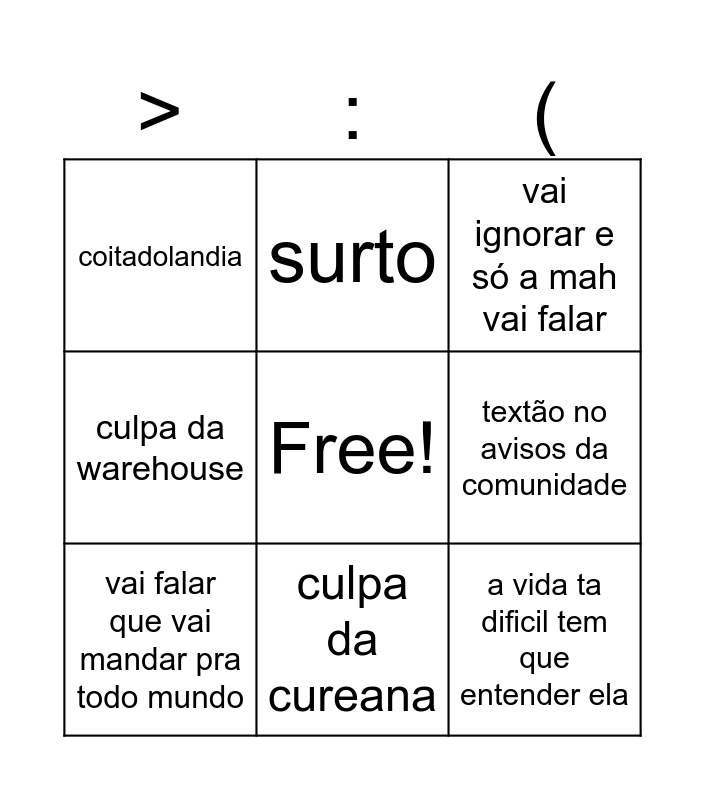 This bingo card has a free space and 8 words: textão no avisos da comunidade, vai ignorar e só a mah vai falar, surto, vai falar que vai mandar pra todo mundo, coitadolandia, a vida ta dificil tem que entender ela, culpa da warehouse and culpa da cureana.