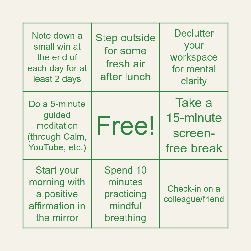 This bingo card has a free space and 11 words: Spend 10 minutes journalling your thoughts, Give a colleague a genuine compliment, Take a 15-minute screen-free break, Start your morning with a positive affirmation in the mirror, Declutter your workspace for mental clarity, Note down a small win at the end of each day for at least 2 days, Spend 10 minutes practicing mindful breathing, Practice digital detox 30 minutes before bed, Do a 5-minute guided meditation (through Calm, YouTube, etc.), Step outside for some fresh air after lunch and Check-in on a colleague/friend.