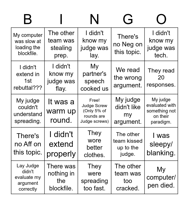 This bingo card has a free space and 24 words: Lay Judge didn't evaluate my argument correctly, I didn't extend properly, My partner's speech cooked us, The other team was too cracked., I didn't know my judge was tech., My computer was slow at loading the blockfile., The other team was stealing prep., I didn't know my judge was lay., My judge didn't like my argument., My judge evaluated with something not on their paradigm., My judge couldn't understand spreading., I didn't know my judge was flay., The other team kissed up to the judge., I was sleepy/ blanking., I didn't extend in 1st rebuttal???, There was nothing in the blockfile., They were spreading too fast., There's no Neg on this topic., They read 20 responses., There's no Aff on this topic., It was a warm up round., They wore better clothes., We read the wrong argument. and My computer/ pen died..