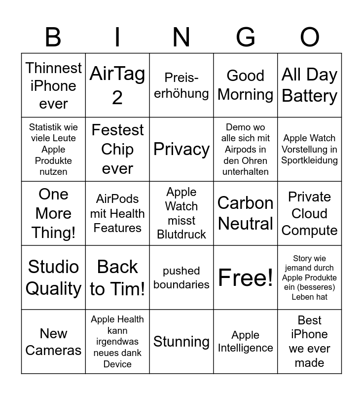 This bingo card has 25 words: Back to Tim!, Stunning, Privacy, New Cameras, All Day Battery, Thinnest iPhone ever, Statistik wie viele Leute Apple Produkte nutzen, AirTag 2, Carbon Neutral, pushed boundaries, Demo wo alle sich mit Airpods in den Ohren unterhalten, One More Thing!, Free!, Story wie jemand durch Apple Produkte ein (besseres) Leben hat, Festest Chip ever, Best iPhone we ever made, Private Cloud Compute, Preis-erhöhung, Apple Watch Vorstellung in Sportkleidung, AirPods mit Health Features, Apple Watch misst Blutdruck, Apple Health kann irgendwas neues dank Device, Studio Quality, Good Morning and Apple Intelligence.