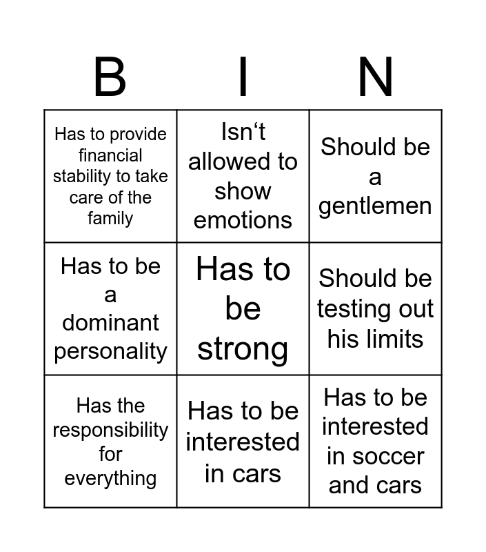 This bingo card has a free space and 9 words: Has the responsibility for everything, Should be a gentlemen, Isn‘t allowed to show emotions, Has to be a dominant personality, Has to provide financial stability to take care of the family, Should be testing out his limits, Has to be interested in soccer and cars, Has to be protective of his family and Has to be interested in cars.