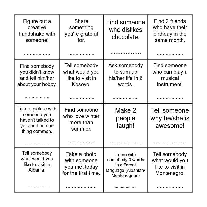 This bingo card has 16 words: Take a photo with someone you met today for the first time. ....................., Tell someone why he/she is awesome! .................., Find someone who dislikes chocolate. .................., Figure out a creative handshake with someone! .................., Take a picture with someone you haven't talked to yet and find one thing common. .................., Share something you're grateful for. .................., Make 2 people laugh! .................., Learn with somebody 3 words in different language (Albanian/ Montenegrian) .................., Find somebody you didn't know and tell him/her about your hobby. .................., Tell somebody what would you like to visit in Kosovo. .................., Tell somebody what would you like to visit in Albania. .................., Find 2 friends who have their birthday in the same month. .................., Find someone who love winter more than summer. .................., Find someone who can play a musical instrument. .................., Ask somebody to sum up his/her life in 6 words. .................. and Tell somebody what would you like to visit in Montenegro. ...................