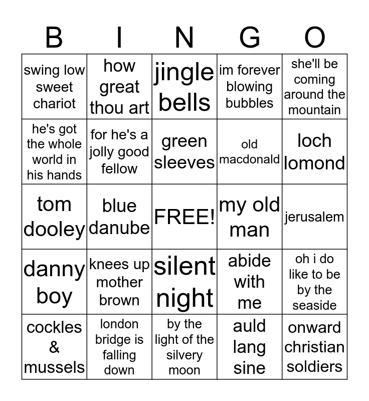This bingo card has a free space and 24 words: knees up mother brown, london bridge is falling down, green sleeves, cockles & mussels, she'll be coming around the mountain, swing low sweet chariot, he's got the whole world in his hands, how great thou art, my old man, silent night, old macdonald, tom dooley, abide with me, oh i do like to be by the seaside, for he's a jolly good fellow, auld lang sine, jerusalem, jingle bells, loch lomond, blue danube, onward christian soldiers, danny boy, im forever blowing bubbles and by the light of the silvery moon.