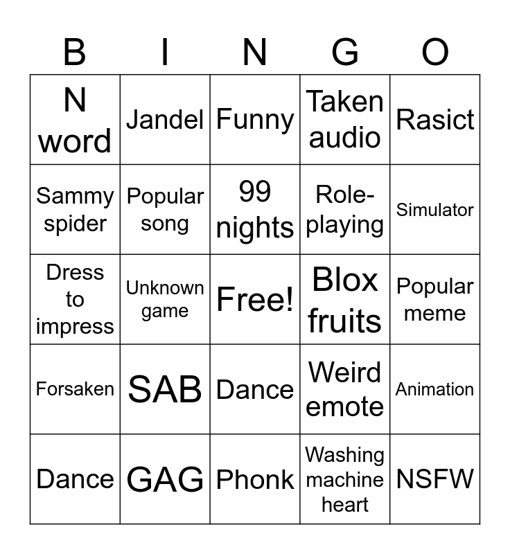 This bingo card has a free space and 24 words: SAB, GAG, 99 nights, Dance, Rasict, N word, Sammy spider, Jandel, Blox fruits, Dance, Role-playing, Dress to impress, Weird emote, Animation, Popular song, Washing machine heart, Popular meme, Funny, Simulator, Unknown game, NSFW, Forsaken, Taken audio and Phonk.