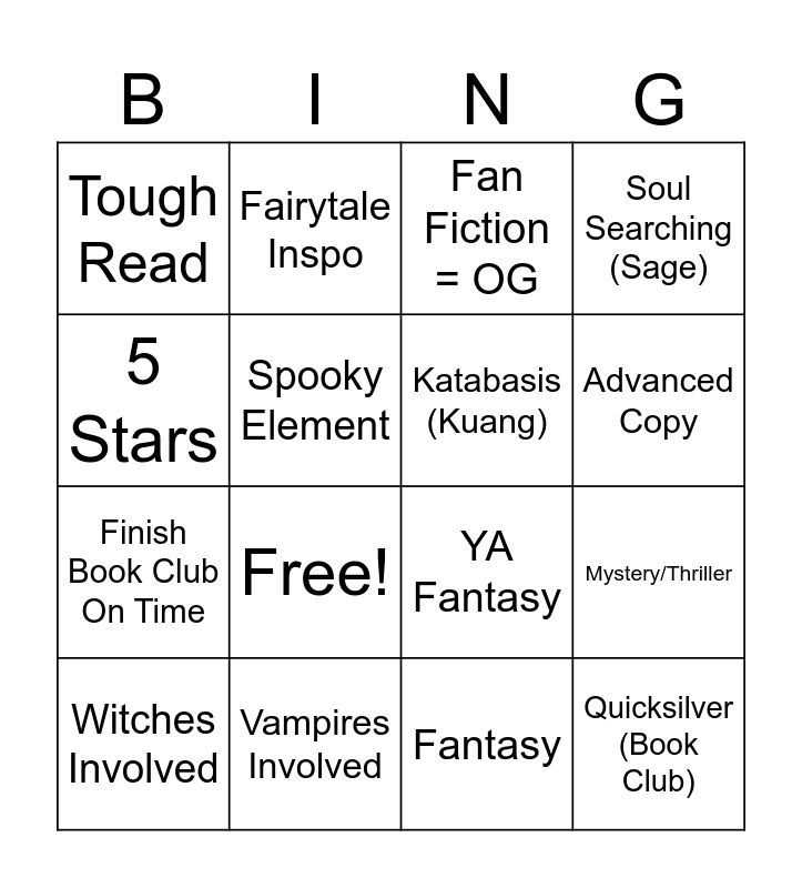 This bingo card has 18 words: Free!, Quicksilver (Book Club), Fan Fiction = OG, Tough Read, YA Fantasy, Soul Searching (Sage), Witches Involved, Fairytale Inspo, Advanced Copy, Finish Book Club On Time, Fantasy, 5 Stars, Mystery/Thriller, Spooky Element, Katabasis (Kuang), Non Fiction 2025, Vampires Involved and October Book Club.