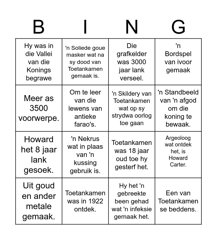 This bingo card has 16 words: Toetankamen was in 1922 ontdek., Argeoloog wat ontdek het, is Howard Carter., Die grafkelder was 3000 jaar lank verseel., Hy was in die Vallei van die Konings begrawe, Howard het 8 jaar lank gesoek., 'n Soliede goue masker wat na sy dood van Toetankamen gemaak is., Toetankamen was 18 jaar oud toe hy gesterf het., Hy het 'n gebreekte been gehad wat 'n infeksie gemaak het., Meer as 3500 voorwerpe., Om te leer van die lewens van antieke farao's., Uit goud en ander metale gemaak., 'n Bordspel van ivoor gemaak, 'n Nekrus wat in plaas van 'n kussing gebruik is., 'n Standbeeld van 'n afgod om die koning te bewaak., 'n Skildery van Toetankamen wat op sy strydwa oorlog toe gaan and Een van Toetankamen se beddens..