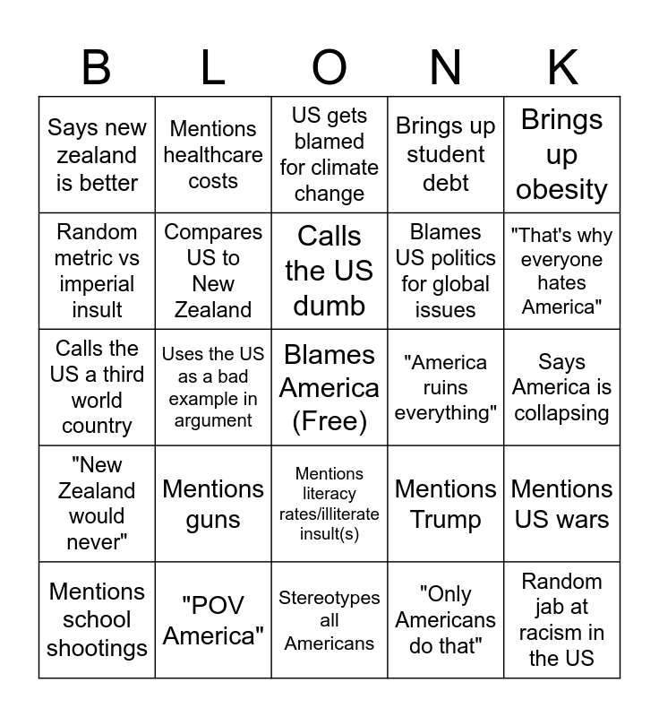 This bingo card has a free space and 24 words: Mentions guns, "POV America", Calls the US dumb, Mentions school shootings, Brings up obesity, Says new zealand is better, Random metric vs imperial insult, Mentions healthcare costs, "America ruins everything", Mentions literacy rates/illiterate insult(s), Blames US politics for global issues, Calls the US a third world country, Mentions Trump, Mentions US wars, Compares US to New Zealand, "Only Americans do that", Says America is collapsing, US gets blamed for climate change, "That's why everyone hates America", Uses the US as a bad example in argument, Random jab at racism in the US, "New Zealand would never", Brings up student debt and Stereotypes all Americans.