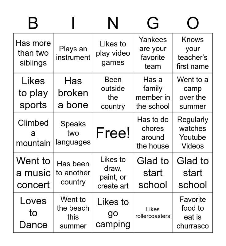 This bingo card has a free space and 29 words: Loves to Dance, Likes to read, Speaks two languages, Plays an instrument, Has more than two siblings, Likes to play video games, Has broken a bone, Has been to another country, Has to do chores around the house, Went to the beach this summer, Regularly watches Youtube Videos, Favorite food to eat is churrasco, Likes to go camping, Likes rollercoasters, Went to a camp over the summer, Favorite subject is Math, Likes to draw, paint, or create art, Went to a music concert, Knows your teacher's first name, Climbed a mountain, Glad to start school, Prefers dogs over cats, Has a family member in the school, Likes to play sports, Yankees are your favorite team, Plays an instrument, Glad to start school, Been outside the country and Like to play sports.