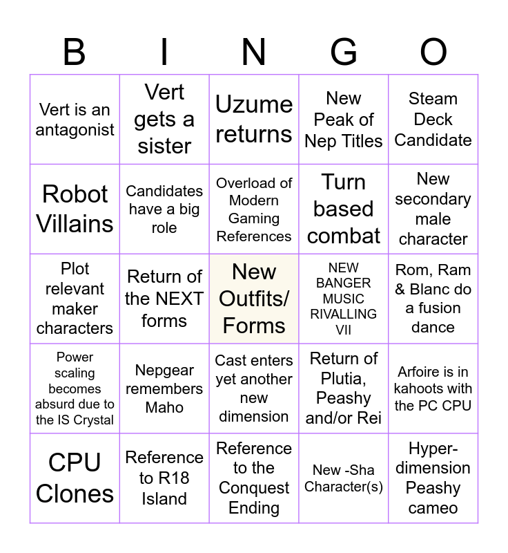 This bingo card has a free space and 24 words: CPU Clones, Nepgear remembers Maho, Overload of Modern Gaming References, New -Sha Character(s), Steam Deck Candidate, Vert is an antagonist, Vert gets a sister, Uzume returns, NEW BANGER MUSIC RIVALLING VII, Rom, Ram & Blanc do a fusion dance, Plot relevant maker characters, Candidates have a big role, Return of Plutia, Peashy and/or Rei, Arfoire is in kahoots with the PC CPU, Robot Villains, Reference to R18 Island, Reference to the Conquest Ending, New Peak of Nep Titles, New secondary male character, Power scaling becomes absurd due to the IS Crystal, Return of the NEXT forms, Cast enters yet another new dimension, Turn based combat and Hyper-dimension Peashy cameo.