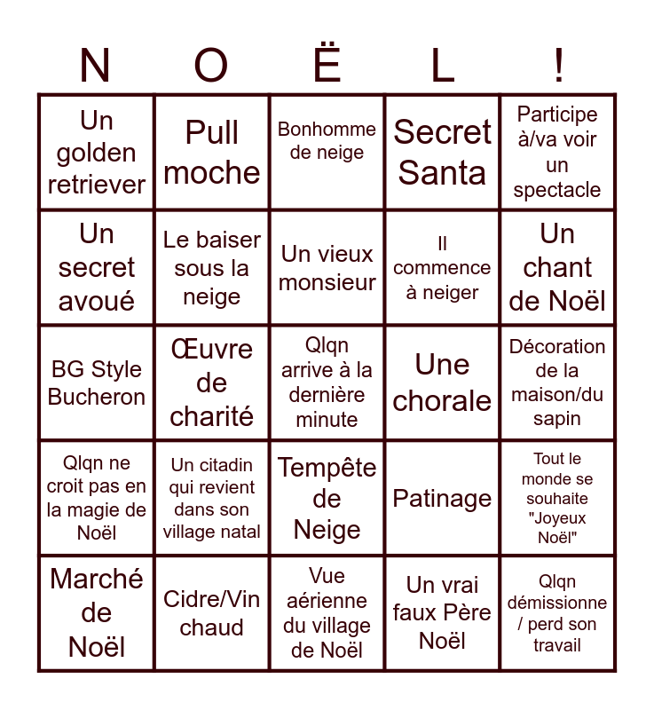 This bingo card has 25 words: Qlqn ne croit pas en la magie de Noël, Cidre/Vin chaud, Qlqn arrive à la dernière minute, Un vrai faux Père Noël, Participe à/va voir un spectacle, Un golden retriever, Pull moche, Bonhomme de neige, Une chorale, Tout le monde se souhaite "Joyeux Noël", Un secret avoué, Le baiser sous la neige, Vue aérienne du village de Noël, Patinage, Un chant de Noël, Marché de Noël, Œuvre de charité, Un vieux monsieur, Il commence à neiger, Décoration de la maison/du sapin, BG Style Bucheron, Un citadin qui revient dans son village natal, Tempête de Neige, Secret Santa and Qlqn démissionne / perd son travail.