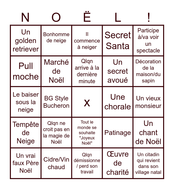 This bingo card has a free space and 24 words: Qlqn ne croit pas en la magie de Noël, Cidre/Vin chaud, Qlqn arrive à la dernière minute, Un vrai faux Père Noël, Participe à/va voir un spectacle, Un golden retriever, Pull moche, Bonhomme de neige, Une chorale, Tout le monde se souhaite "Joyeux Noël", Un secret avoué, Le baiser sous la neige, Patinage, Un chant de Noël, Marché de Noël, Œuvre de charité, Un vieux monsieur, Il commence à neiger, Décoration de la maison/du sapin, BG Style Bucheron, Un citadin qui revient dans son village natal, Tempête de Neige, Secret Santa and Qlqn démissionne / perd son travail.