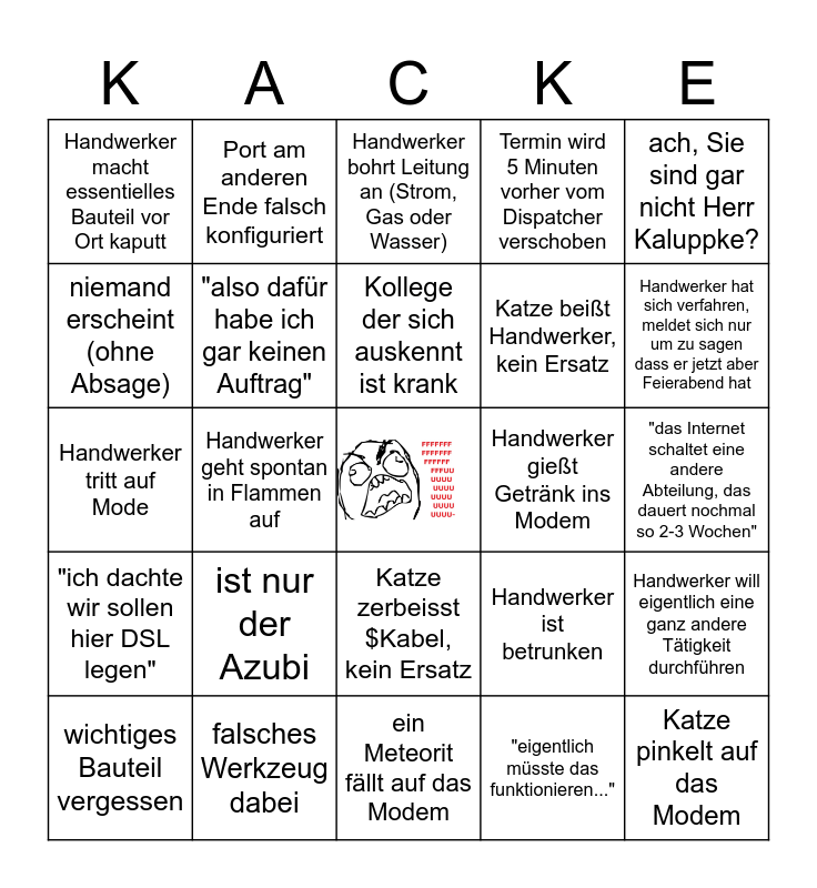 This bingo card has a free space and 24 words: ist nur der Azubi, falsches Werkzeug dabei, Kollege der sich auskennt ist krank, wichtiges Bauteil vergessen, ach, Sie sind gar nicht Herr Kaluppke?, Handwerker macht essentielles Bauteil vor Ort kaputt, niemand erscheint (ohne Absage), Port am anderen Ende falsch konfiguriert, Handwerker gießt Getränk ins Modem, Katze zerbeisst $Kabel, kein Ersatz, Katze beißt Handwerker, kein Ersatz, Handwerker tritt auf Mode, Handwerker ist betrunken, Handwerker will eigentlich eine ganz andere Tätigkeit durchführen, "also dafür habe ich gar keinen Auftrag", "eigentlich müsste das funktionieren...", "das Internet schaltet eine andere Abteilung, das dauert nochmal so 2-3 Wochen", Handwerker bohrt Leitung an (Strom, Gas oder Wasser), Handwerker hat sich verfahren, meldet sich nur um zu sagen dass er jetzt aber Feierabend hat, Handwerker geht spontan in Flammen auf, Katze pinkelt auf das Modem, "ich dachte wir sollen hier DSL legen", Termin wird 5 Minuten vorher vom Dispatcher verschoben and ein Meteorit fällt auf das Modem.
