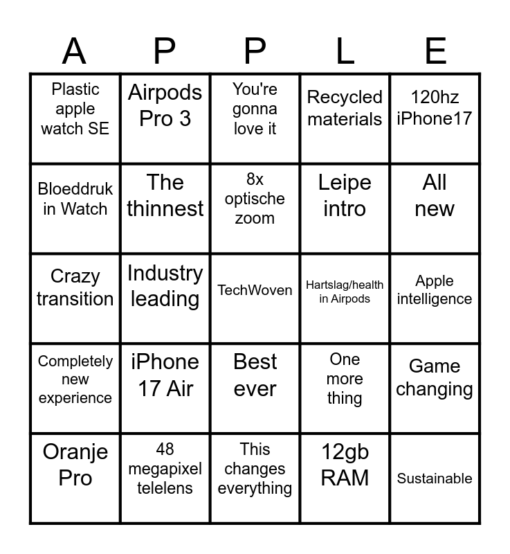 This bingo card has a free space and 24 words: iPhone 17 Air, 48 megapixel telelens, 8x optische zoom, Oranje Pro, 120hz iPhone17, Plastic apple watch SE, Bloeddruk in Watch, Airpods Pro 3, Hartslag/health in Airpods, Best ever, Leipe intro, Crazy transition, One more thing, Game changing, The thinnest, 12gb RAM, Apple intelligence, You're gonna love it, All new, Industry leading, Sustainable, Completely new experience, Recycled materials and This changes everything.