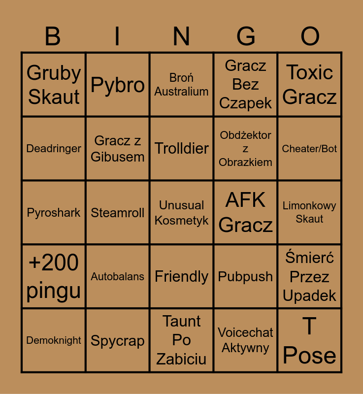 This bingo card has a free space and 24 words: Autobalans, Spycrap, Trolldier, Demoknight, Toxic Gracz, Gruby Skaut, Deadringer, Pybro, AFK Gracz, Friendly, Obdżektor z Obrazkiem, Pyroshark, Pubpush, Śmierć Przez Upadek, Gracz z Gibusem, Voicechat Aktywny, Limonkowy Skaut, Broń Australium, Cheater/Bot, Steamroll, T Pose, +200 pingu, Gracz Bez Czapek and Taunt Po Zabiciu.