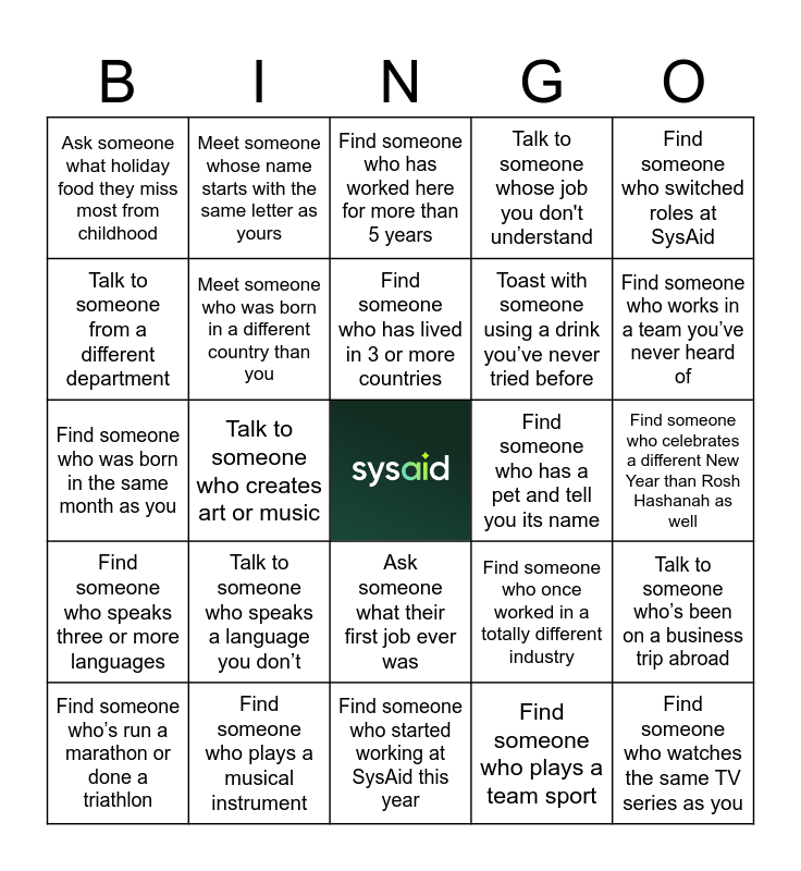 This bingo card has a free space and 27 words: Find someone who once worked in a totally different industry, Find someone who joined SysAid in the last 3 months, Toast with someone using a drink you’ve never tried before, Find someone who started working at SysAid this year, Talk to someone from a different department, Find someone who has worked here for more than 5 years, Meet someone whose name starts with the same letter as yours, Find someone who speaks three or more languages, Find someone who has a pet and tell you its name, Talk to someone who’s been on a business trip abroad, Find someone who was born in the same month as you, Talk to someone whose job you don't understand, Find someone who’s run a marathon or done a triathlon, Find someone who plays a musical instrument, Find someone who works in a team you’ve never heard of, Talk to someone who's not on Slack with you regularly, Meet someone who was born in a different country than you, Find someone who has lived in 3 or more countries, Talk to someone who speaks a language you don’t, Ask someone what holiday food they miss most from childhood, Find someone who celebrates a different New Year than Rosh Hashanah as well, Find someone who plays a team sport, Talk to someone who creates art or music, Find someone who watches the same TV series as you, Ask someone what their first job ever was, Find someone who switched roles at SysAid and Find someone who once worked in a totally different industry.