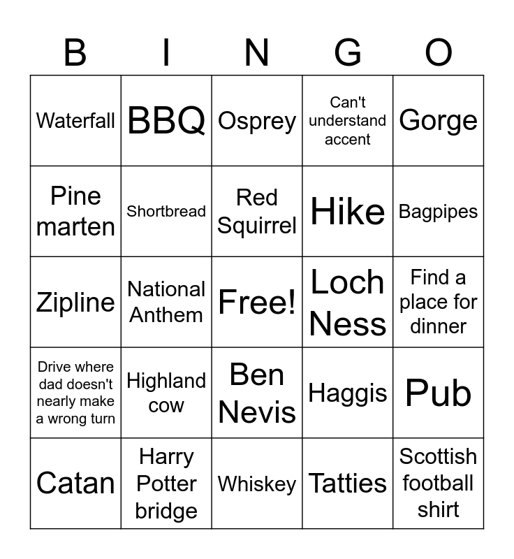 This bingo card has a free space and 24 words: Highland cow, Harry Potter bridge, Red Squirrel, Catan, Gorge, Waterfall, Pine marten, BBQ, Loch Ness, Ben Nevis, Hike, Zipline, Haggis, Pub, Shortbread, Tatties, Find a place for dinner, Osprey, Bagpipes, National Anthem, Scottish football shirt, Drive where dad doesn't nearly make a wrong turn, Can't understand accent and Whiskey.