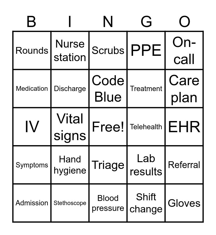 This bingo card has a free space and 30 words: Stethoscope, HIPAA, Vital signs, Charting, Rounds, Scrubs, Discharge, Triage, Telehealth, Blood pressure, EHR, Gloves, Shift change, Diagnosis, Care plan, Patient safety, Lab results, Symptoms, Hand hygiene, On-call, IV, Consent, Nurse station, Treatment, Medication, PPE, Referral, Admission, Code Blue and Pulse.