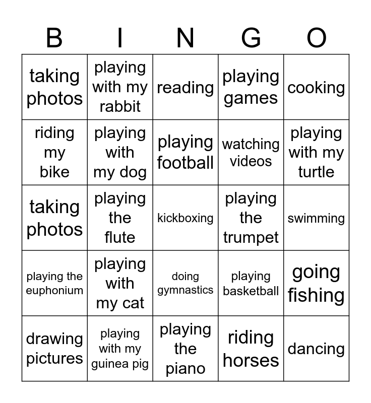 This bingo card has 25 words: playing with my cat, playing the piano, playing football, drawing pictures, cooking, taking photos, riding my bike, playing with my rabbit, playing the trumpet, doing gymnastics, watching videos, taking photos, playing basketball, going fishing, playing with my dog, dancing, swimming, reading, playing with my turtle, playing the flute, kickboxing, playing with my guinea pig, playing the euphonium, playing games and riding horses.