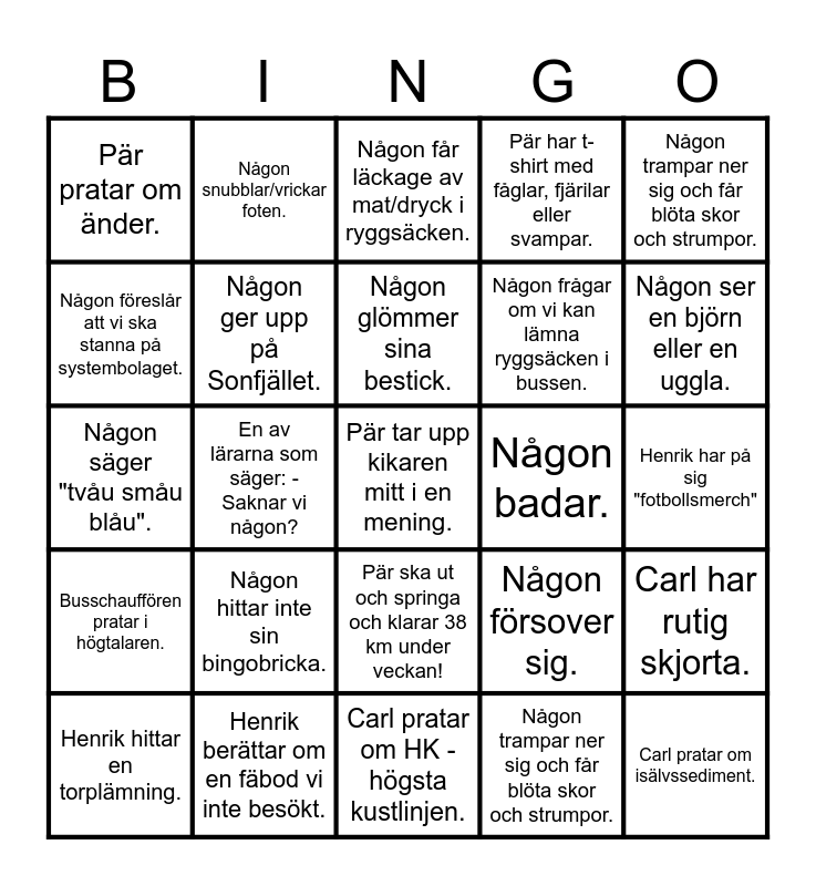 This bingo card has 25 words: Busschauffören pratar i högtalaren., Henrik berättar om en fäbod vi inte besökt., Pär tar upp kikaren mitt i en mening., Någon trampar ner sig och får blöta skor och strumpor., Någon trampar ner sig och får blöta skor och strumpor., Pär pratar om änder., Någon snubblar/vrickar foten., Någon får läckage av mat/dryck i ryggsäcken., Någon badar., Carl har rutig skjorta., Någon föreslår att vi ska stanna på systembolaget., Någon ger upp på Sonfjället., Carl pratar om HK - högsta kustlinjen., Någon försover sig., Någon ser en björn eller en uggla., Henrik hittar en torplämning., En av lärarna som säger: -Saknar vi någon?, Någon glömmer sina bestick., Någon frågar om vi kan lämna ryggsäcken i bussen., Henrik har på sig "fotbollsmerch", Någon säger "tvåu småu blåu"., Någon hittar inte sin bingobricka., Pär ska ut och springa och klarar 38 km under veckan!, Pär har t-shirt med fåglar, fjärilar eller svampar. and Carl pratar om isälvssediment..