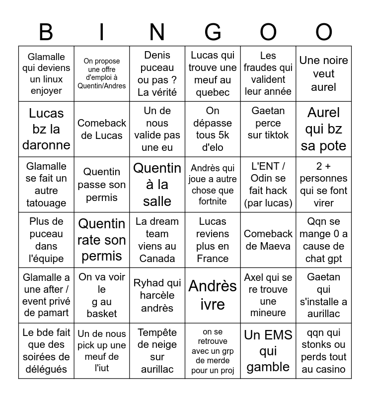 This bingo card has 36 words: Andrès ivre, Ryhad qui harcèle andrès, on se retrouve avec un grp de merde pour un proj, Lucas bz la daronne, Plus de puceau dans l'équipe, Andrès qui joue a autre chose que fortnite, Comeback de Lucas, Tempête de neige sur aurillac, Les fraudes qui valident leur année, Axel qui se re trouve une mineure, Aurel qui bz sa pote, Lucas qui trouve une meuf au quebec, Gaetan qui s'installe a aurillac, Quentin passe son permis, On dépasse tous 5k d'elo, Glamalle qui deviens un linux enjoyer, Glamalle a une after / event privé de pamart, L'ENT / Odin se fait hack (par lucas), Glamalle se fait un autre tatouage, Denis puceau ou pas ? La vérité, Quentin à la salle, Quentin rate son permis, Lucas reviens plus en France, La dream team viens au Canada, Comeback de Maeva, On propose une offre d'emploi à Quentin/Andres, Gaetan perce sur tiktok, Un de nous pick up une meuf de l'iut, Un de nous valide pas une eu, Une noire veut aurel, qqn qui stonks ou perds tout au casino, Le bde fait que des soirées de délégués, Qqn se mange 0 a cause de chat gpt, 2 + personnes qui se font virer, On va voir le g au basket and Un EMS qui gamble.