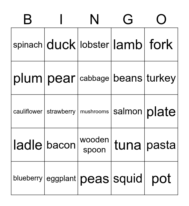 This bingo card has a free space and 31 words: peas, dumpling, strawberry, raspberry, spinach, lobster, pear, tuna, salmon, squid, plate, pot, whipped cream, venison, turkey, ham, pasta, bacon, ladle, wooden spoon, fork, sausage, blueberry, duck, beans, plum, lamb, cauliflower, eggplant, cabbage and lettuce.
