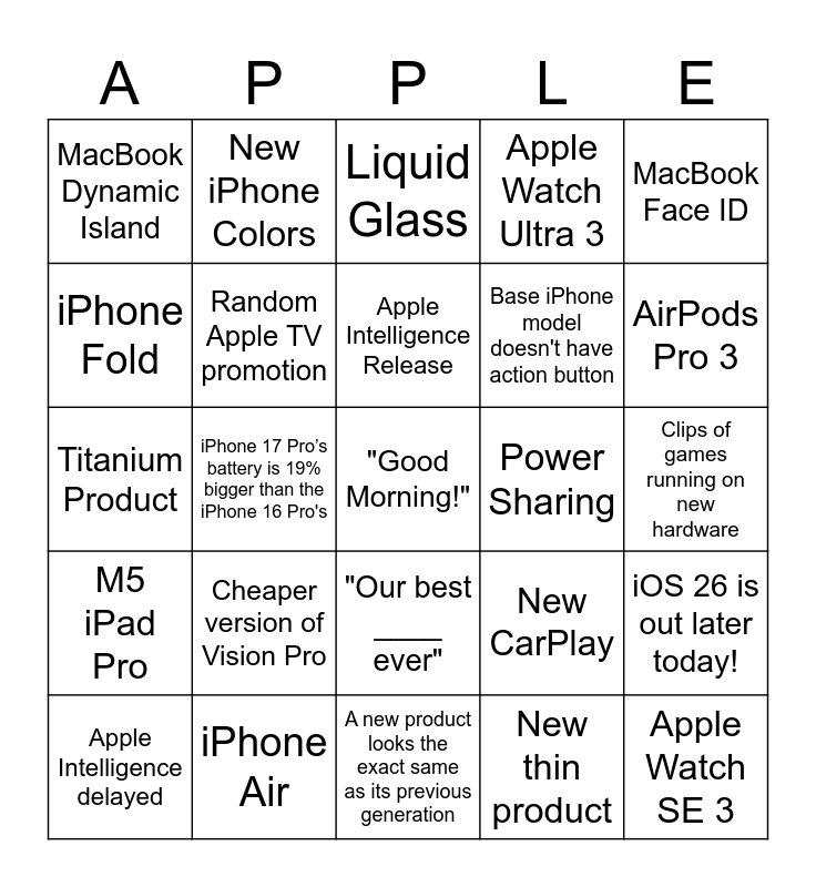 This bingo card has a free space and 24 words: Cheaper version of Vision Pro, iPhone Air, Apple Intelligence Release, Apple Intelligence delayed, MacBook Face ID, MacBook Dynamic Island, iPhone Fold, New iPhone Colors, Power Sharing, "Our best ____ ever", Base iPhone model doesn't have action button, Titanium Product, New CarPlay, iOS 26 is out later today!, Random Apple TV promotion, New thin product, Clips of games running on new hardware, Liquid Glass, AirPods Pro 3, iPhone 17 Pro’s battery is 19% bigger than the iPhone 16 Pro's, Apple Watch SE 3, M5 iPad Pro, Apple Watch Ultra 3 and A new product looks the exact same as its previous generation.