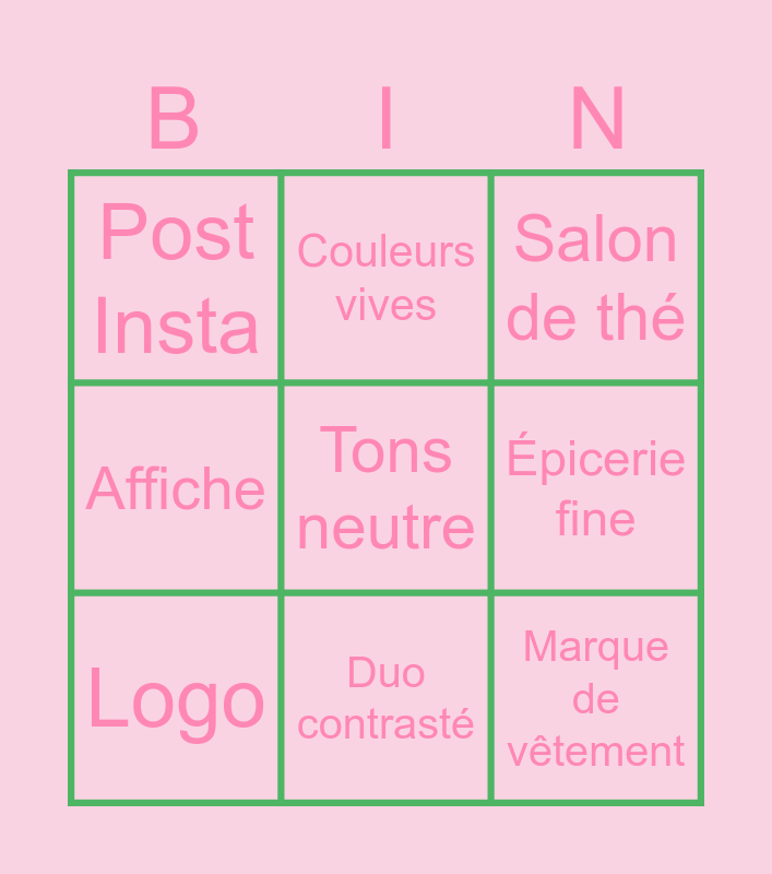 This bingo card has 9 words: Logo, Tons neutre, Salon de thé, Post Insta, Couleurs vives, Épicerie fine, Affiche, Duo contrasté and Marque de vêtement.
