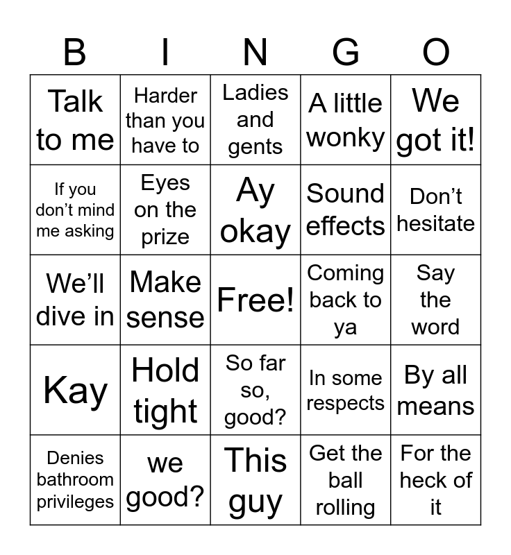 This bingo card has a free space and 41 words: Ready to roll, We’ll dive in, Its a full house, Eyes on the prize, we good?, So far so, good?, Ay okay, Get the idea, We got it!, Kay, Make sense, A little wonky, For the heck of it, Say the word, Coming back to ya, Hold tight, Uh, oh, Talk to me, Good morning, Ladies and gents, By all means, Absolutely positively, This guy, Sound effects, Bingo, If you don't mind me asking, Get the ball rolling, Bang for our buck, Don’t hesitate, Pardon me, First of all, Harder than you have to, Denies bathroom privileges, Really and truly does, In some respects, If you don’t mind me asking, If you don’t mind putting your phone in the tote, Now granite, In other words, Better yet and Barking.