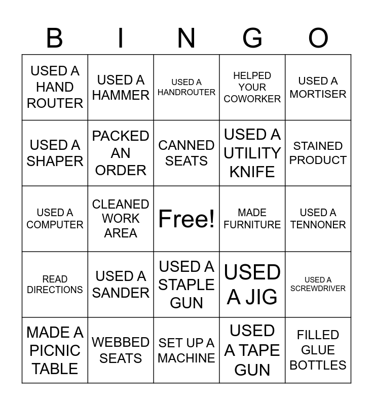 This bingo card has a free space and 24 words: USED A SANDER, WEBBED SEATS, CANNED SEATS, MADE A PICNIC TABLE, USED A MORTISER, USED A HAND ROUTER, USED A SHAPER, USED A HAMMER, MADE FURNITURE, USED A STAPLE GUN, USED A UTILITY KNIFE, USED A COMPUTER, USED A JIG, USED A SCREWDRIVER, PACKED AN ORDER, USED A TAPE GUN, USED A TENNONER, USED A HANDROUTER, STAINED PRODUCT, CLEANED WORK AREA, FILLED GLUE BOTTLES, READ DIRECTIONS, HELPED YOUR COWORKER and SET UP A MACHINE.