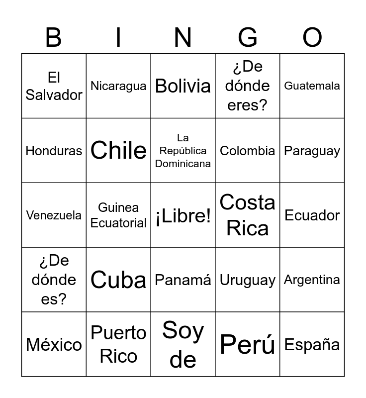 This bingo card has a free space and 24 words: Cuba, Puerto Rico, La República Dominicana, México, Guatemala, El Salvador, Honduras, Nicaragua, Costa Rica, Panamá, Colombia, Venezuela, Uruguay, Argentina, Chile, Perú, Ecuador, Bolivia, Paraguay, Guinea Ecuatorial, España, ¿De dónde es?, ¿De dónde eres? and Soy de.
