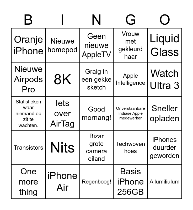 This bingo card has a free space and 24 words: Nits, iPhone Air, Graig in een gekke sketch, One more thing, Liquid Glass, Oranje iPhone, Nieuwe Airpods Pro, Nieuwe homepod, Onverstaanbare Indiase Apple medewerker, Bizar grote camera eiland, Apple Intelligence, Statistieken waar niemand op zit te wachten., Techwoven hoes, iPhones duurder geworden, 8K, Basis iPhone 256GB, Sneller opladen, Geen nieuwe AppleTV, Watch Ultra 3, Iets over AirTag, Allumiliulum, Transistors, Vrouw met gekleurd haar and Regenboog!.
