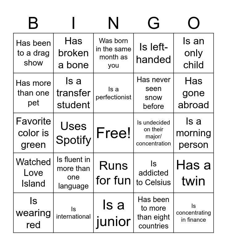 This bingo card has a free space and 24 words: Is fluent in more than one language, Is international, Is a perfectionist, Is wearing red, Is an only child, Has been to a drag show, Has more than one pet, Has broken a bone, Is undecided on their major/ concentration, Runs for fun, Has never seen snow before, Favorite color is green, Is addicted to Celsius, Has a twin, Is a transfer student, Has been to more than eight countries, Is a morning person, Was born in the same month as you, Has gone abroad, Uses Spotify, Is concentrating in finance, Watched Love Island, Is left-handed and Is a junior.