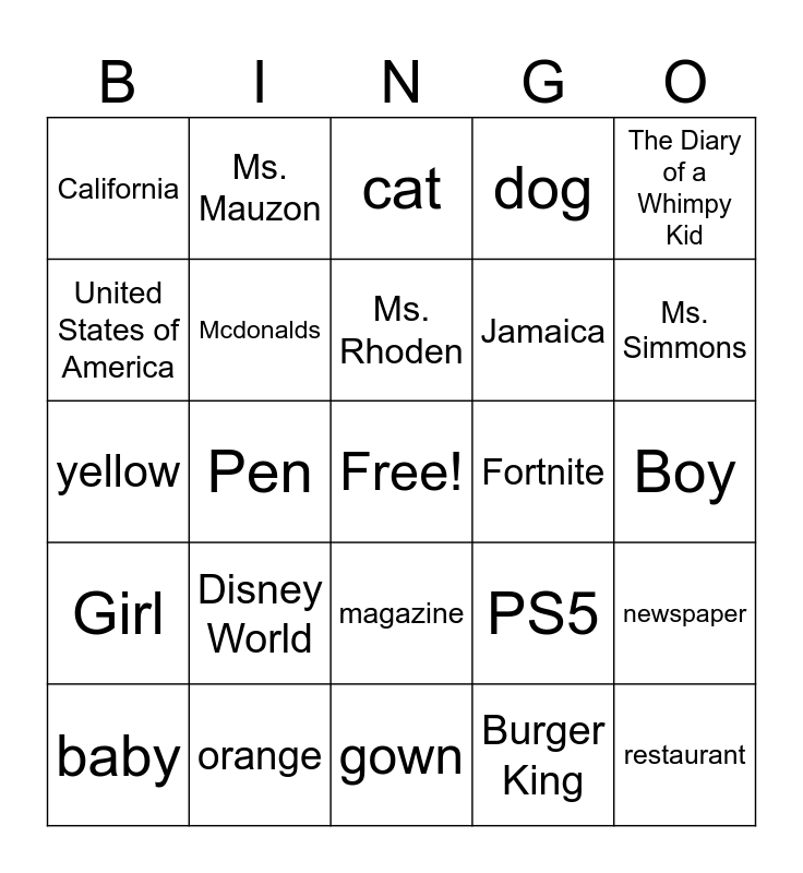 This bingo card has a free space and 24 words: Disney World, orange, Ms. Rhoden, baby, The Diary of a Whimpy Kid, California, United States of America, Ms. Mauzon, Fortnite, magazine, Jamaica, yellow, PS5, newspaper, Mcdonalds, Burger King, Boy, cat, Ms. Simmons, Pen, restaurant, Girl, dog and gown.