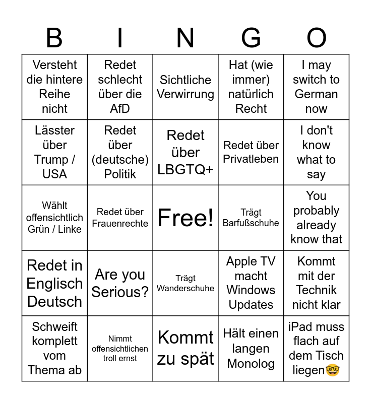 This bingo card has a free space and 24 words: Are you Serious?, Nimmt offensichtlichen troll ernst, Redet über LBGTQ+, Schweift komplett vom Thema ab, I may switch to German now, Versteht die hintere Reihe nicht, Lässter über Trump / USA, Redet schlecht über die AfD, Trägt Barfußschuhe, Trägt Wanderschuhe, Redet über Privatleben, Wählt offensichtlich Grün / Linke, Apple TV macht Windows Updates, Kommt mit der Technik nicht klar, Redet über (deutsche) Politik, Hält einen langen Monolog, You probably already know that, Sichtliche Verwirrung, I don't know what to say, Redet über Frauenrechte, iPad muss flach auf dem Tisch liegen🤓, Redet in Englisch Deutsch, Hat (wie immer) natürlich Recht and Kommt zu spät.