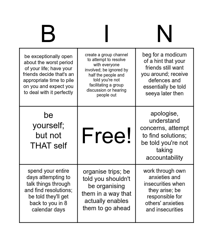 This bingo card has a free space and 8 words: apologise, understand concerns, attempt to find solutions; be told you're not taking accountability, beg for a modicum of a hint that your friends still want you around; receive defences and essentially be told seeya later then, create a group channel to attempt to resolve with everyone involved; be ignored by half the people and told you're not facilitating a group discussion or hearing people out, spend your entire days attempting to talk things through and find resolutions; be told they'll get back to you in 8 calendar days, be exceptionally open about the worst period of your life; have your friends decide that's an appropriate time to pile on you and expect you to deal with it perfectly, work through own anxieties and insecurities when they arise; be responsible for others' anxieties and insecurities, be yourself; but not THAT self and organise trips; be told you shouldn't be organising them in a way that actually enables them to go ahead.