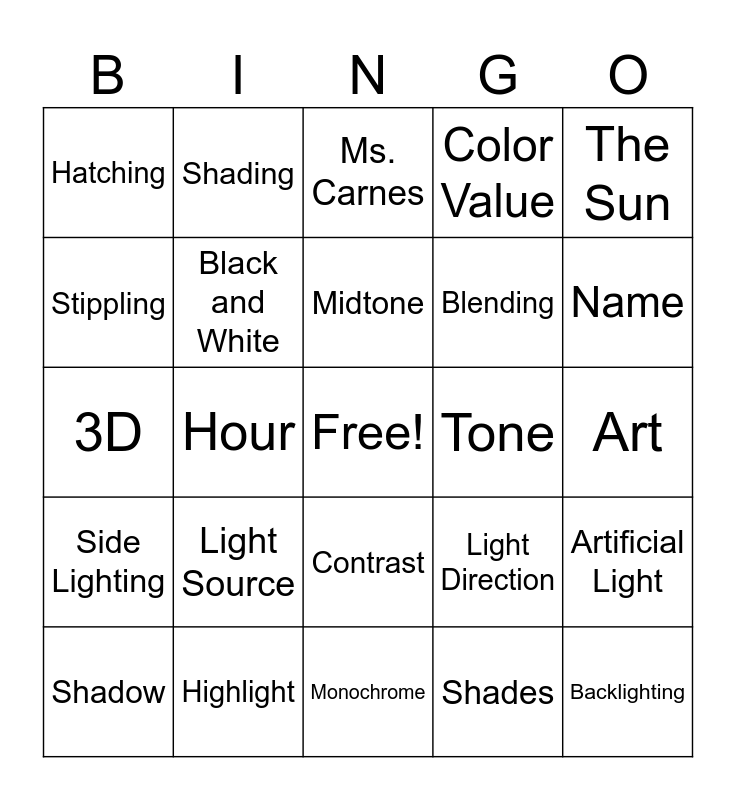 This bingo card has a free space and 24 words: Light Source, Highlight, Midtone, Shadow, The Sun, Hatching, Stippling, Shading, Tone, Contrast, Blending, 3D, Light Direction, Artificial Light, Black and White, Shades, Art, Ms. Carnes, Name, Hour, Backlighting, Side Lighting, Color Value and Monochrome.