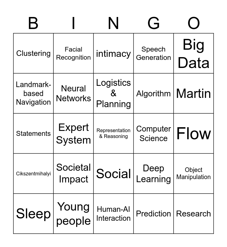 This bingo card has 50 words: Perception, Representation & Reasoning, Machine Learning, Human-AI Interaction, Societal Impact, Object Recognition, Facial Recognition, Speech Recognition, Landmark-based Navigation, Statistical Learning, Neural Networks, Speech Generation, Object Manipulation, Deep Learning, Autonomous Cars, Natural Language Processing, Logistics & Planning, Computer Science, Medical Diagnosis, Big Data, Expert System, Prediction, Clustering, Algorithm, Model, Research, Martin, Identity, intimacy, Social, Reading myself, Seeing myself, Playing myself, Expressing myself, Young people, Mass society, Paradox of leisure, I-thou Relationship, Health, Flow, Léanne, Lilly, Tomke, Paris, Sleep, Statements, Cucumber, Kelly, Cikszentmihalyi and Community.